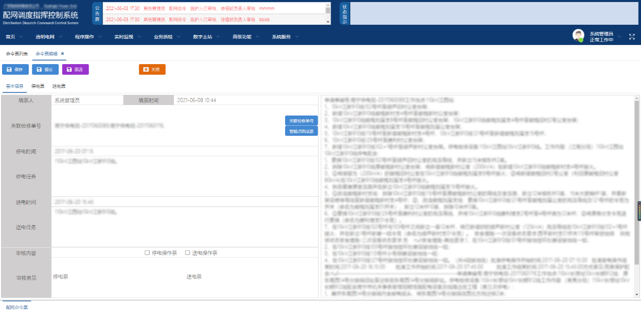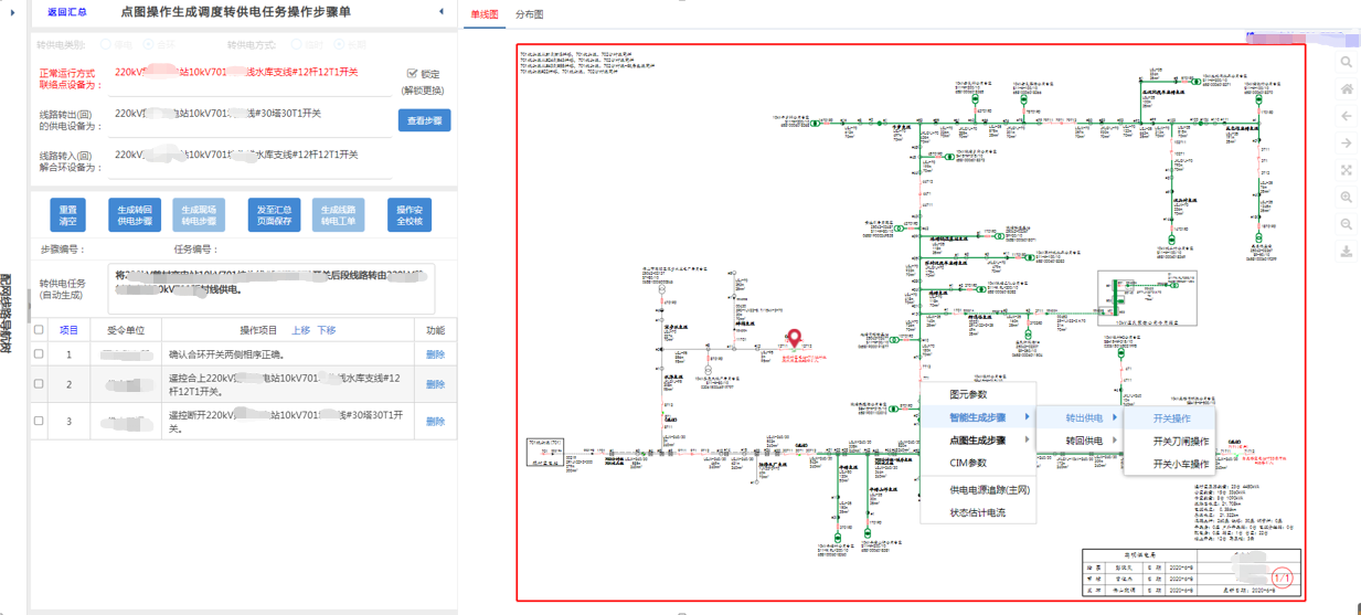 2) Based on the increasingly mature ring network diagram of DEC in the field of distribution network master station, the system shares the power grid model, graph and real-time operation information with OCS, develops the function of drawing simulation permit with high practical value, realizes the visualization of drafting link, and supports the whole process from drafting to approval and execution to prevent false locking. The whole process of drafting with scatter diagram is intelligently generated based on GIS model data, which has the characteristics such as standardization, high efficiency and burden alleviation, and has the functions of single-step issuing, intelligent drafting, historical permit generation, reverse intelligent generation, etc. The operation permit generated is subject to anti-misoperation check, power flow check, and operation rule check, and can be intelligently generated by scatter diagram operation instead of manual filling by dispatchers and field personnel.