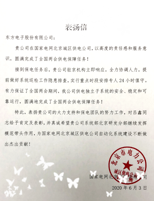 前不久,2020年全国两会胜利闭幕,公司收到用户的表扬信,表扬我公司协助圆满完成两会保电任务。