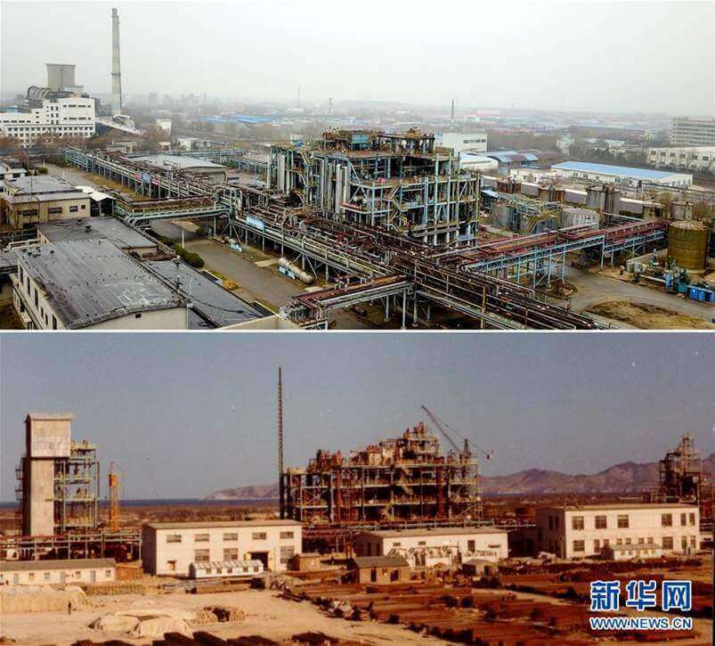 上图:烟台万华化学集团第一条MDI生产线全面停产后拆除;下图:建设中的烟台合成革厂(烟台万华化学集团前身)MDI生产线。新华社发