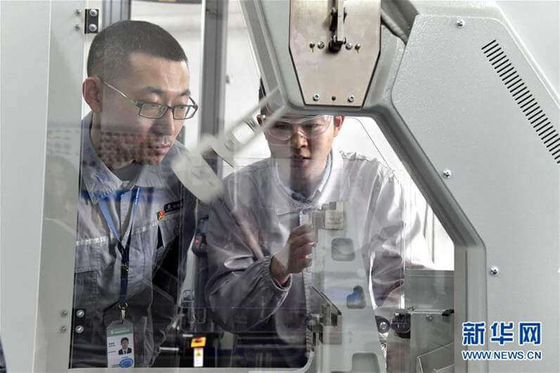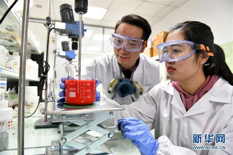 在烟台万华化学集团中央研究院先进表面材料中心,纪晓晓博士(右)和厉涛博士在做水性环保甲油实验(2018年12月8日摄)。新华社记者郭绪雷 摄
