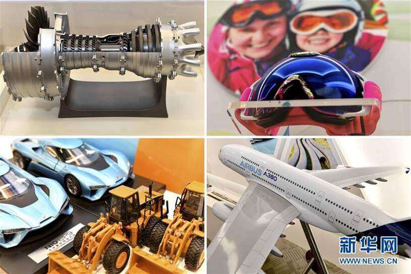 这是在万华烟台工业园展厅里展示的万华高分子材料在不同领域产品上的应用(拼版照片,4月30日摄)。新华社记者 郭绪雷 摄